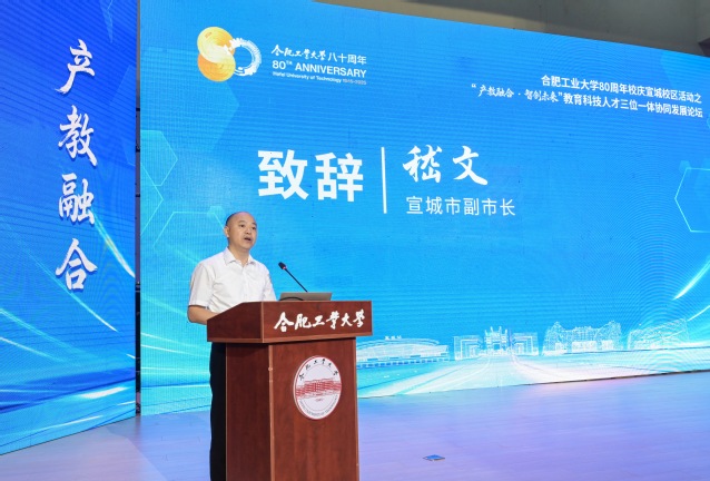八秩岁月砥砺风雨,初心如磐向新而行。10月5日,在喜迎合肥工业大学建校80周年之际,“产教融合·智创未来”教育科技人才三位一体协同发展论坛在宣城校区隆重举行。32名来自不同领域的院士专家、学校优秀毕业生、宣城优秀企业代表、在校师生共300余人齐聚宛陵诗地,围绕教育强国建设,聚焦技术创新与人才培养共谋产教融合高质量发展新篇。合肥工业大学校长汪萌,校党委常委、副校长吴华清,宣城市副市长杨林秀、嵇文,宣城校区党委副书记、管委会主任蒋传东等出席论坛。